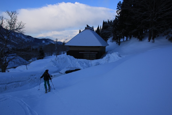 朝は白馬あたりまで小雪が舞う天気だったけど、その先小谷はすっかり青空に。道中からは朝日を浴びた大渚山が見えております。南面は既に終わってますね~。夜雪が降る予報だったのですが、新しい雪はまぶした程度。除雪が入る心配もなし。大草連は先客ナシで一番乗りでした。