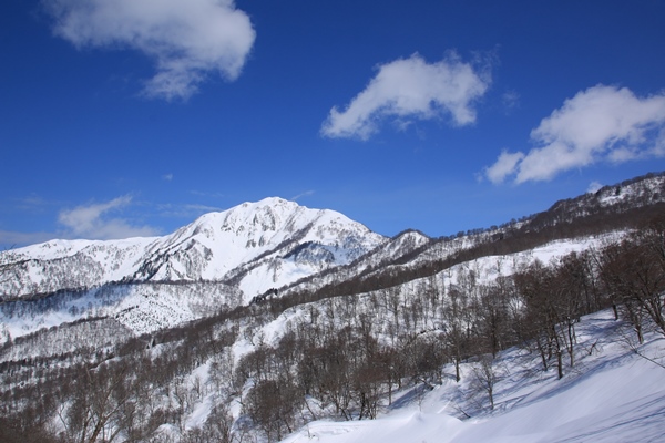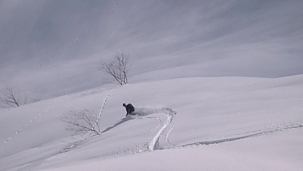 さて、大渚沢の無木立斜面はどんな感じかな?雪庇の間から滑り込みます。ブナの林ほどではないですが、やや重ながら気持ちよく滑れました。無木立から再びブナ林に突入!標高は下げても依然として軽い雪の斜面が続きます。気持ちよかったので、いつも登り返すあたりも通り過ぎ、約1100mあたりまで滑りました。