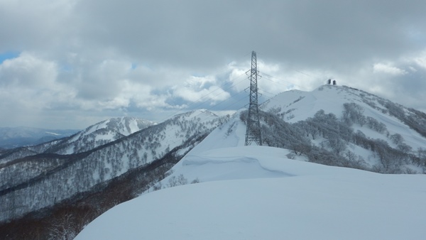 尾根を見渡せる広い場所に出ます。ここは送電線が何本も通っています。貝吹岳は奥羽山脈の稜線上にあるけど、1000mに足りない低い山。昔の街道や送電線が集まるわけですな。いったん尾根に出てから仙岩峠へ。途中のブナ林は雪質も樹間もいい感じ!帰りが楽しみであります。