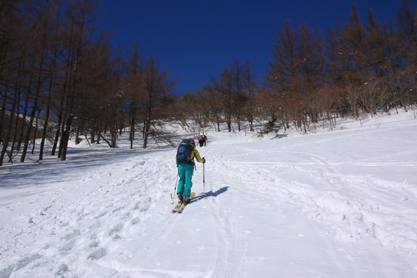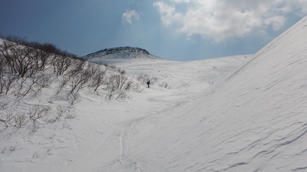 ひと登りで薬師岳。ゴンドラが動いていれば、ここまで来れます。山頂まで2時間ほどだったので、ゴンドラ動いてれば、さらに短時間で登れたんですね。周りを見れば、ほとんどが歩きの人たち。スキーの人はほとんどいませんでした。夏道のある尾根通しに登っていきました。風も弱くて気温も高めで、雪が堅くなることもなく登ることができました。