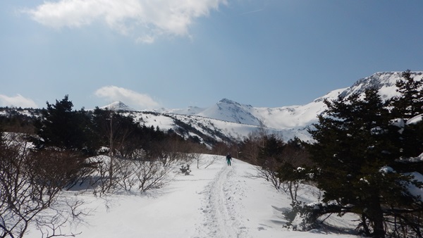 いい塩梅、リフトが動き出す頃には風はやみました。リフト2本乗り継いだところがスタート地点。ちなみに1回券は460円。1本目は短いから歩いた方がよかったかも…。2本目リフトを下りて準備。急斜面を登って、薮っぽい灌木の中を進むとやっと視界が広がります。目指す安達太良山もバッチリ見えてます。予報に反して良い天気!