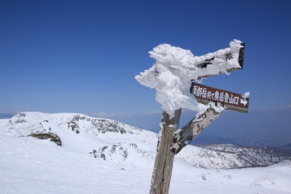 山頂の付け根で板をはずし、とりあえず安達太良山に登頂!天気はバッチリ晴れです。会津方面に少し雲が多くて空も白いかな。近場では和尚山と船明神山がなんとなく気になりました。秋山くらいで歩いてみたいところです。これから向かう矢筈森が見えるけど、スキーで滑って行けるのかなあ…。まあ、行きながら考えるか…