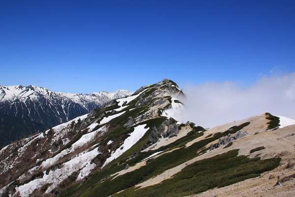 合戦小屋でアイゼン履きます。6本歯。ほとんど雪だけど、尾根上の一部と燕山荘下は雪が途切れていました。さて、今日は鉄板の晴れ予報かと思いきや、朝から雲が多め。合戦沢の頭で展望が開けるんですが、半分は雲に覆われてしまってます。たぶん、お約束の信州側に湧き上がる雲でしょう。稜線からの展望に期待!