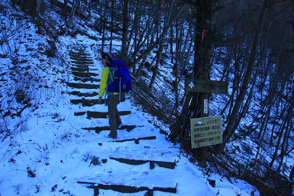 ゲートの少し手前のスペースに止めて林道歩きからスタート。余分に2キロほど歩かされます。8時に富士山の目論見が、だいぶ遅れてしまう…。林道を登ってる間、既に降りてくる人が2人いました。新道峠のご来光狙いかな?今日は朝から快晴で、きっとご来光は素晴らしかったでしょね。新道峠だけの人は、2キロ手前でゲート閉まってたら帰る人も多いだろうな。