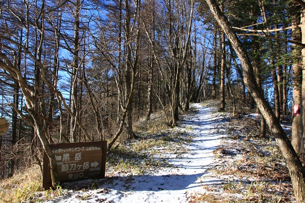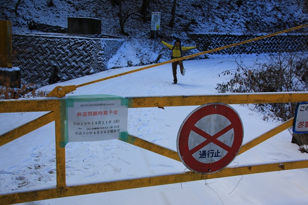新道峠への林道は12/11から冬季閉鎖とありましたが、雪が降ったせいか12/9には前倒しで閉鎖になっていました。