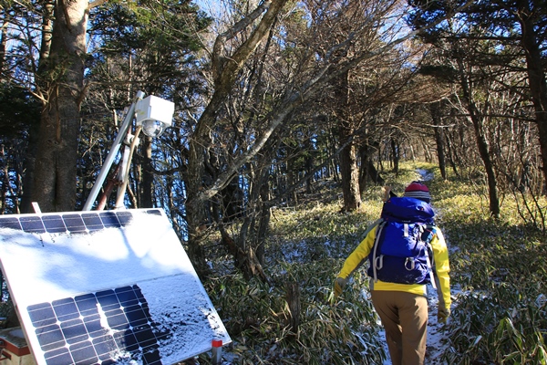 展望台ばっかりで、なかなか先に進みません。破風山の手前のを最後に展望台はなくなります。やっと黒岳に向けて歩く感じですね。稜線の雪はせいぜい2~3センチかな。少しの雪でもクッションになって足は楽。下りはよく滑りましたけど…。また、景色も少し白いだけで、冬の雰囲気が高まります。空は真っ青だし。