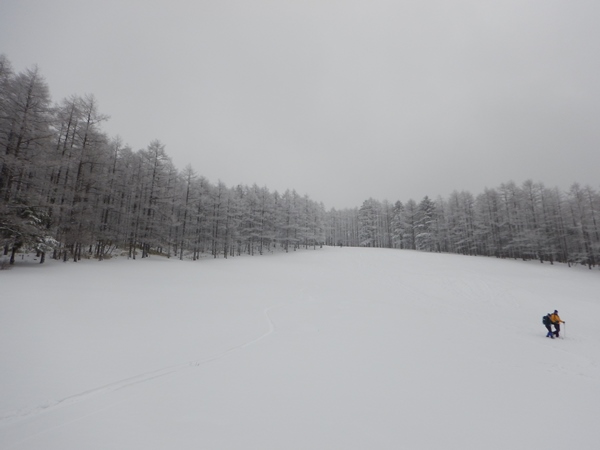 天気は回復しそうにないし、山頂まで行っても仕方ないかな…。スキー場跡から林に入って少しのところでやめることにしました。スキー場跡は北向きなので雪質まずまず。ただ、杭が邪魔。間隔はあるけど気になりますね…。そのまま林道を滑って入笠湿原へ。湿原は往きにも増して賑やかになっていました。
