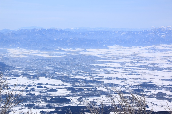 ある程度下ったところから猫石のある尾根の裾を巻くように古城ヶ峰へ。下の平らなところは視界に乏しくやや単調。古城ヶ峰の東にあるポコの北斜面が疎林になってて良さそうなのは昨年に確認済み。今回はそこを滑りたいと考えていたのですが、吹きさらしのためカチコチで滑るに及ばず…。尾根通しで古城ヶ峰に向かいます。登るにつれ、背後の磐梯山が大きくなっていきます。左手には猪苗代湖が大きい!会津若松などの街もよく望めました。