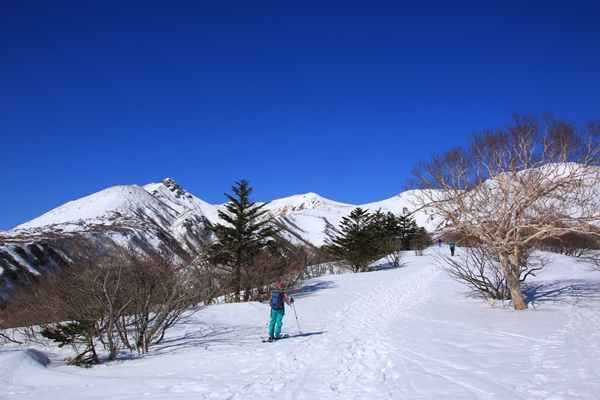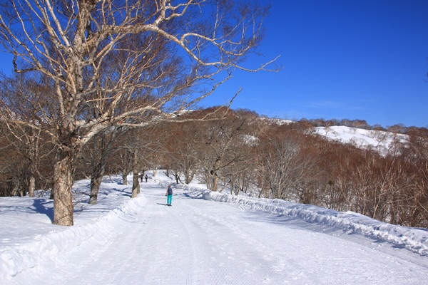 さてと出発です。出発地点から既に景色のいいことといったら!巨大ダケカンバが点在する、なんとものどかな風景です。今は使われていないリフトがあるとこまで、圧雪されたところを歩きます。登山者と山スキーの比率は10:1くらいに感じます。