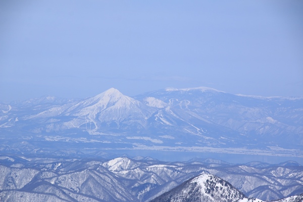 赤面山からの尾根と合流するあたりから雪付きが悪くなります。吹きさらしなので雪が飛ばされてしまってます。ガタガタでカチカチで、歩くのも滑るのもスキーには向かないとこです。周りの雰囲気、登山者とスキーヤーの比率などをみても、安達太良山とよく似てるなと感じました。緯度が少し違うだけで立地も同じだし。