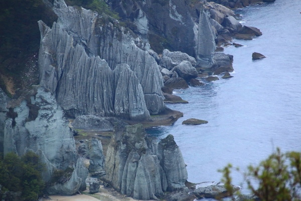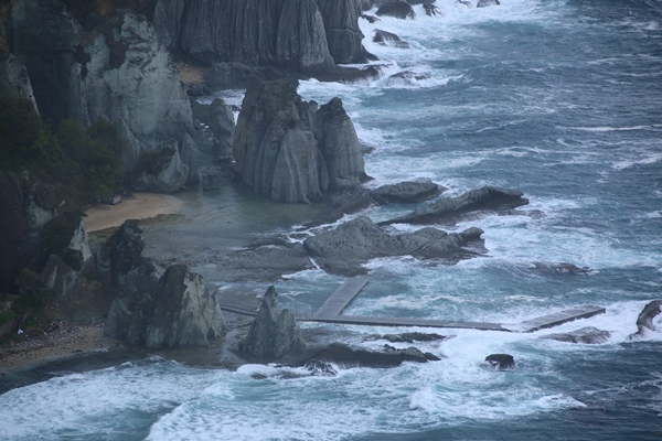 天気が回復することを願いつつ、仏ヶ浦に向かいましたが、願いは叶わず…。それでも一応最寄りの港であります牛滝港へ。牛滝港あたりでも仏ヶ浦を思わせる奇岩がありました。徒歩で仏ヶ浦に行く駐車場に立ち寄ると、こんな天気にもかかわらず車がたくさん止まっていましたね。今日は船が出てないようなので、歩く人が多いのかも。このあと、パーキングになっている展望台へ。だいぶ遠いけど、仏ヶ浦の全容が見えたのかな…?