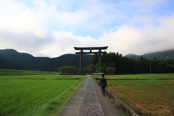 本宮大社から戻ってくると、『日本一の大鳥居』の看板が目に入ります。なんだかよくわからんけど、二度と来ることないかもしれないので行っとくか。大鳥居は田んぼの真ん中に、まったく神社らしくない雰囲気のところにありました。