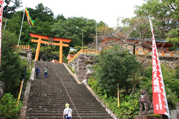 滝見物のあとは熊野那智大社と青岸渡寺へ。目的はもちろん三重塔と滝の景色。熊野那智大社へはまた階段をたくさん登ります。手術した膝のよい筋トレになります。熊野那智大社はなんと修復中。囲いがしてあって見れず…。