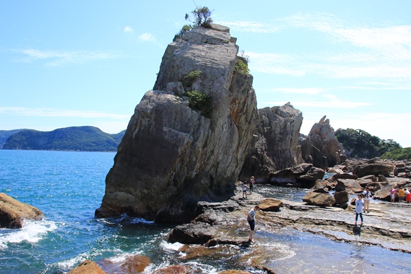 那智の滝のあとは橋杭岩へ。橋杭岩の駐車場が道の駅になってて、入口で順番待ち渋滞になっていました。観光地にしてはちょっと狭いかな…。ずらりと並ぶ岩は火山の割れ目からの溶岩のようです。割れ目噴火ってやつかな?それが水面ギリギリに出て来てるのがスゴイなと思いました。