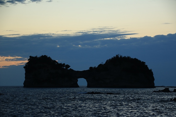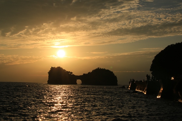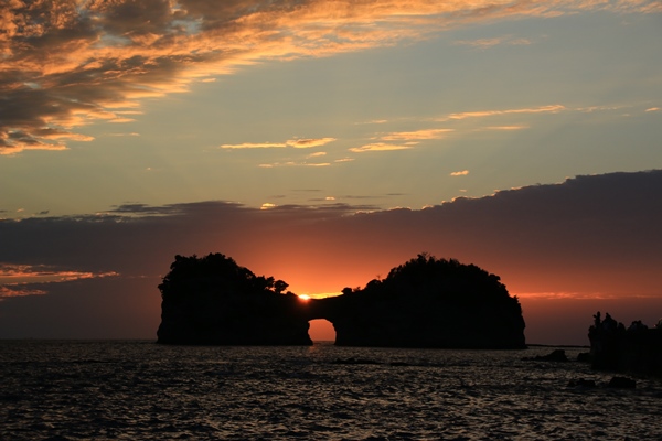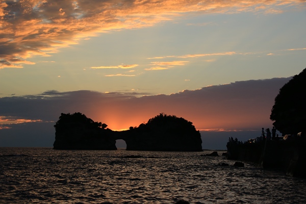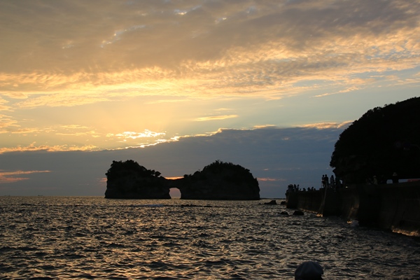 だんだんと陽が落ちてきて、太陽が円月島に近付いてきます。ほぼ晴れなのですが、水平線に近いところには雲があります。いったんその雲に隠れてしまいますが、円月島の間際でまた出現。あとは円月島の窓に太陽が収まればメデタシ!・・・だったのですが、窓に来る前に雲に隠れてしまいました。詰めが甘かった…