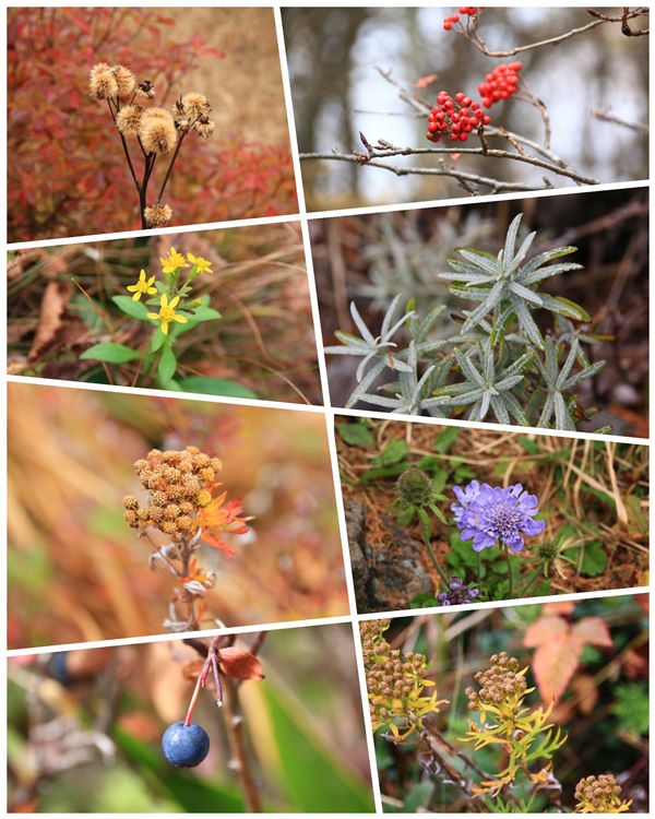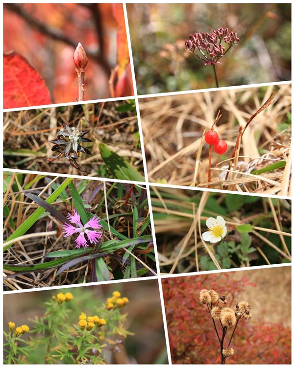 まずは丘から歩きます。池の平湿原の北西側にあるなだらかな稜線です。このへん火山なので、恐らく池の平が火口で、周囲は外輪山になるのかな?カラマツの黄葉はボチボチですが、なんといっても天気が悪くて暗い。風景は写真撮る気がしないので、そこらにある植物を撮ります。しぶとく咲いてる花だったり、花の残骸だったり、紅葉した葉っぱだったり、実だったり芽だったり…。これが案外楽しかったりで。