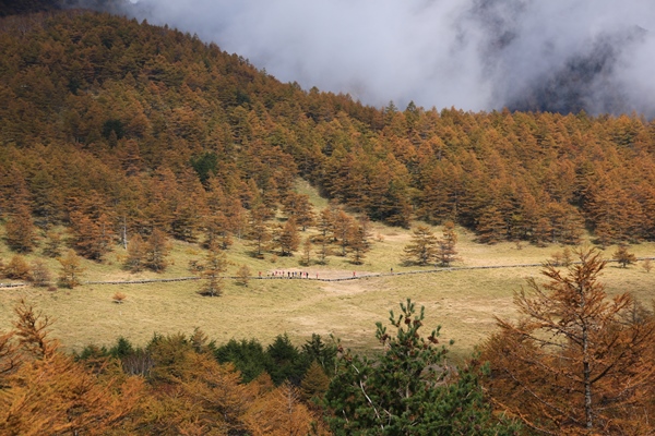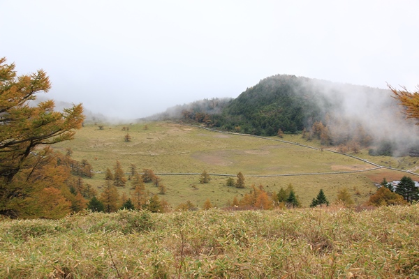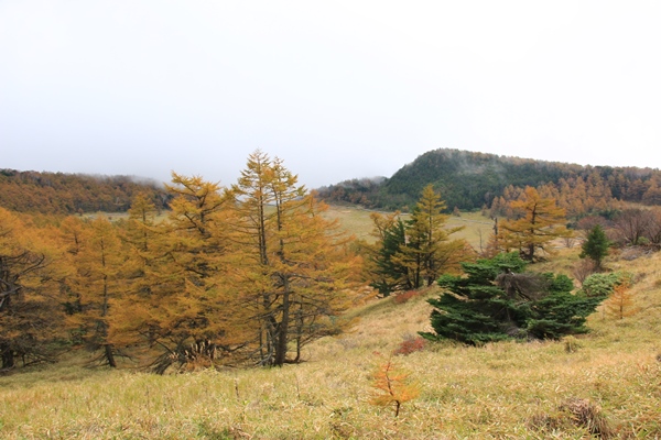 カラマツの黄葉がほぼ見頃な池の平を歩いてきました。湯ノ丸の近くの。駐車場のある兎平から北西側の緩やかな外輪山を歩き、帰りは湿原を突っ切る周回コース。地図のタイムは1時間チョイというお手軽さです。時間的には短いけど、いいとこ取りのコースなので結構充実してました。残念なのは天気。後半になって晴れてきたけど、前半はベッタリした雲の中でした。