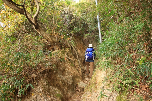 稜線に出る前に自然探求路の分岐がありますが、この秋の台風で通行止めだそうな…。主稜線に出ると少し雰囲気良くなります。ただ、雰囲気良いのは稜線の奈良県側だけで、大阪側は杉の植林です。稜線に出て一息つく間もなくアップダウンの応酬。しかも階段なので太ももに堪えます…。