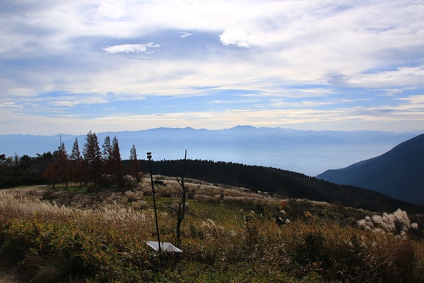 いいとこなナシで終わってしまうのか…と思いつつ山頂へ。すると、山頂直下から開けたススキ原に!展望も素晴らしいです。雲は多めですが、なんだか雰囲気の良い淡い雲で、水彩画のようでした。空気がそんなに澄んでなかったけど、大阪平野と奈良盆地は見えました。ススキ越しの金剛山の眺めがよかったかな。ロープウェイ始発前で人がいなかったのもよかった。