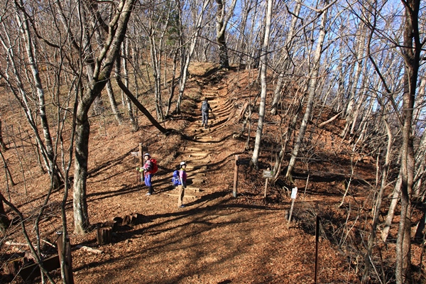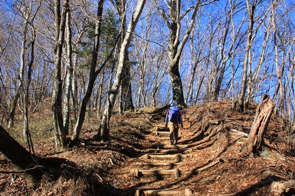 途中に見晴し小屋という立派なデッキの展望台がありました。展望台は立派だけど、景色はたいしたことなくて、大岳山や御前山が見える程度。さらにブナの路を登っていきます。奥多摩では一番のブナ林だそうな…。ブナ林といってもブナの純林ではなく、雑木林にブナが混じる感じです。