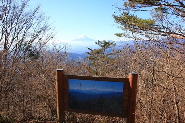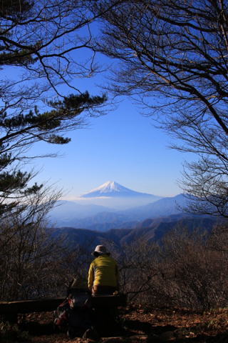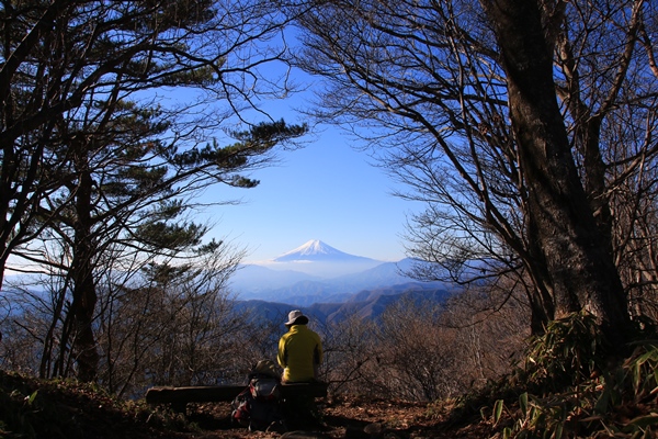 西峰の山頂は広くなってて、ゆっくり休める雰囲気です。富士山だけが見えるように切り開かれています。ですので、富士山が樹林の額縁に収まったように見えます。富士山に向かって座れるベンチで落ち着きます。このあたりには際立った目を引くような山がありません。しかがって、富士山が見えるか見えないかは大きな差。昨日の大山では見えなかったけど、今日はいい感じで見れてよかったです。