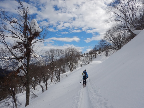 ま、こんな雪なので下まで降りても疲れるだけ。中段で滑るのやめて、シール着けてトラバースする林道辿って、登りの尾根に戻ります。尾根の南側の斜面は日を浴びてズブズブでした。板が埋まって進まん…。ヒョエーとか言いながら滑るのもまた楽し…です。下山したら車が2台増えていました。
