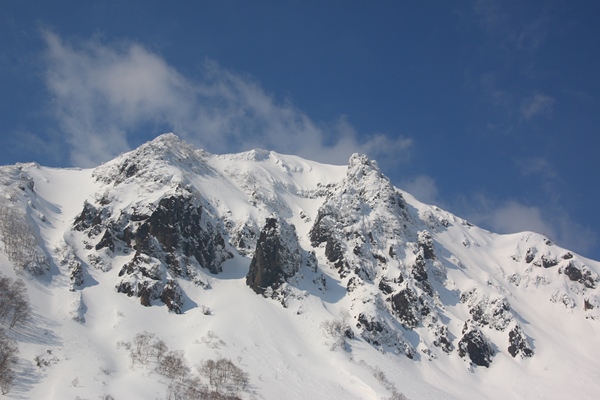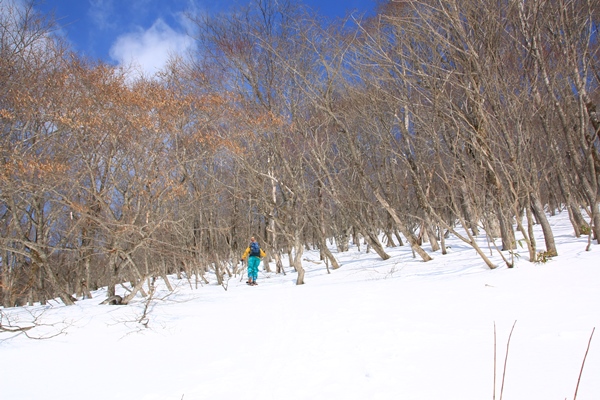 山頂からしばらくは滑るの不可能。モーグル得意な人は滑れるのかなあ…?弘法清水の少し上には沢状になってて1本のシュプールあり。新雪が溜まってるように見えます。もちろん滑りますが、滑り出しはモナカ。途中から密度の濃いパウダーに。全部で5ターンしました。最初の2ターンはモナカでヨレヨレ。次の2ターンはよかった!最後は変な雪になって玉砕。でも気持ちよかった!このあと、黄金清水でワンポイント板をはずしたけど、登りの時よりスキーで来れました。
