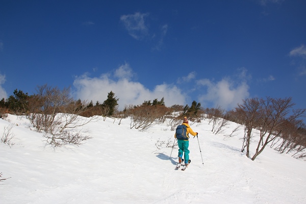 板を背負ったのは一段分のみ。またスキーで歩きますが、あまりスッキリはしてないですね。弘法清水まで来ると、あとは山頂へとひと登り。下半分はなんとかスキーで登れたけど、途中からはツツジの凸凹と氷化した雪面に難儀します。意地で頑張ってたけど、途中で諦めました。無駄な力を使いました。潔く背負えばよかった…