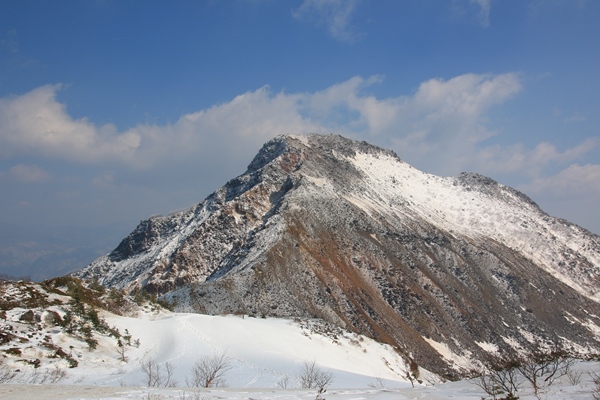 コルからは風通しが良いので雪付きが悪いです。あるのは雪というより氷です。黄金清水の斜面は板担ぎました。T世さんは板をデポ。この先スキーでまともに登ったり滑ったりはできないから、歩くのが正解でしょう。板背負ったりと面倒にはなりますが、それに余りある展望に面倒さは和らぎます。背後の櫛ヶ峰と沼ノ平のロケーションが素晴らしいです。