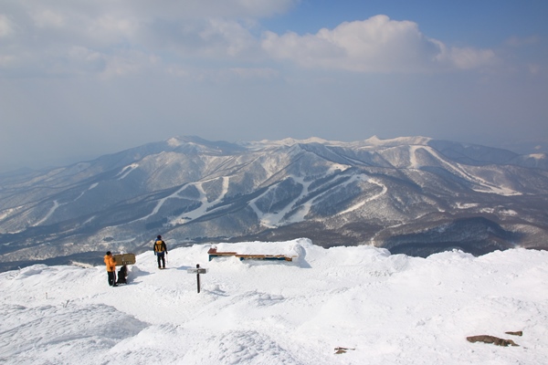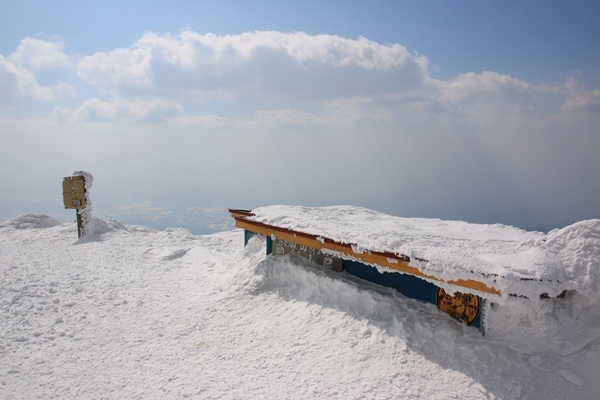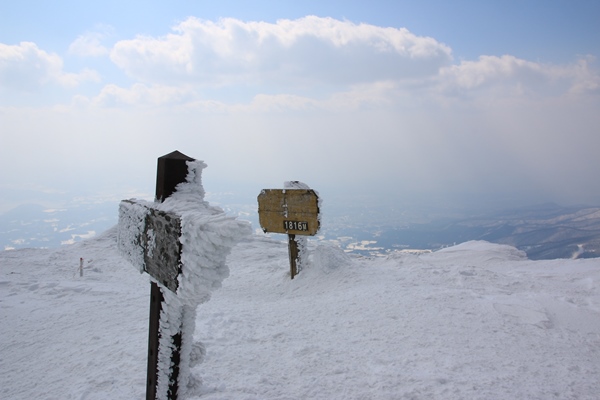 磐梯山の山頂に到着!山頂は3回目かな。春先に一度、秋に一度、そして今回が冬。いい山ですね、磐梯山は。やっぱ火山はロケーションが素晴らしいです。展望は相変わらずでモヤモヤしてます。朝に比べると若干マシになってきたみたいで、飯豊なんかも見えてきました。飯豊は別格な感じですね。