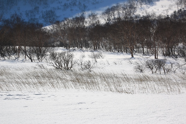 前回来た2016年は雪が少なかった年ですが、今年も似たような雪の量ですね~。沼ノ平の雪も少な目。湿原の枯れ草が露出してるところもありました。それにしても沼ノ平はいいとこですね~。広々とした湿原と荒々しい磐梯山が対照的です。ちょっと藪っぽいのが玉に瑕ですが、これは雪が多い年でも変わらないのかな…と思ったり。