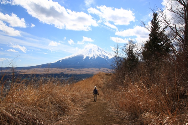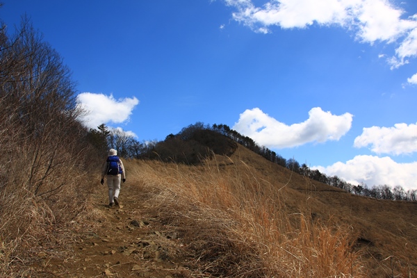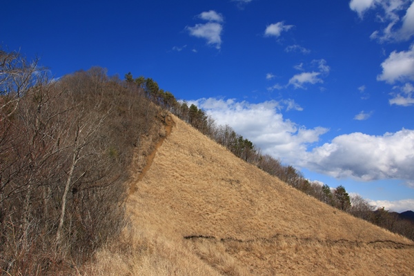 道は急で大変なのですが、展望が素晴らしいので、神経をどっちにも集中させないと…。尾根の北側は雑木林で、南の富士山側はカヤトの原っぱ。富士山との間には遮るものがないはずだけど、今日は雲が遮ってます。午後ほど良い予報になってるので、帰りに期待しましょう。