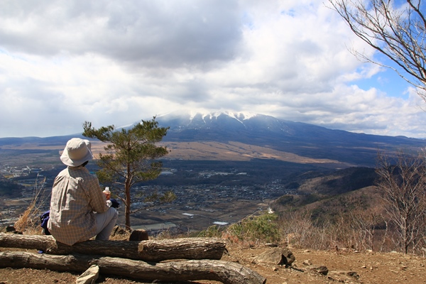 高座山は尖った山容なので、山頂は狭いです。狭い中にベンチが一つ。貸し切りだったので占有できました。登ってきたぶん、忍野の街は見下ろす感じに。相変わらず富士山の上半分は雲の中。そこそこ高いところまで見えていますが、昨日の雨が雪だった気配は薄いです。