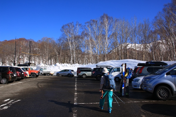 一緒に行くまー君は既に6時に到着とのこと。集合は一応7時。7時の時点で半分ほど除雪された駐車スペースはほぼ満車でした。これ以降は隅っこに止めたり、路駐になるんでしょう。笹ヶ峰周辺の雪壁はかなり低めな様子。これでも寒の戻りが連続したおかげで、持ちこたえてるんでしょうね。そのまま暖かかったら終わってたかも…