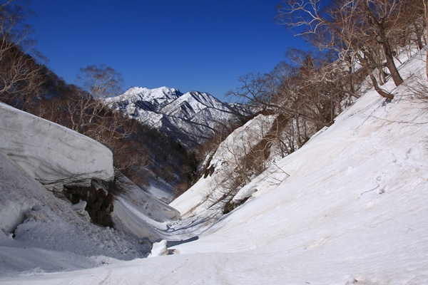 笹ヶ峰から黒沢橋までは同じ景色を1時間歩くのでウンザリします。橋周辺の黒沢はあちこち穴が開いてて、橋の上の雪も少ないです。黒沢詰めるのは厳しいとの情報もありましたが、夏道はしんどいので様子見がてら黒沢を。一番細く急になるノドの部分が際どい感じだったかな。アイゼン忘れたボードの人たちは引き返してました。念のためアイゼン履いて登ったけど、すでに日当たり良好で緩んでました。