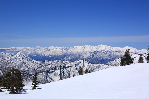 奥に越後山脈、手前に関田山脈、中ほど右に野沢温泉スキー場