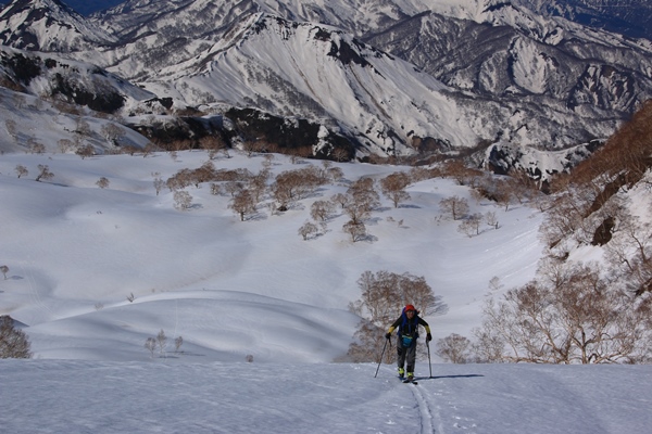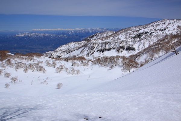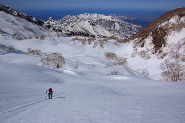 2本目を滑り終えて、大雪原で大休止。ポカポカで景色も良く、登り返しに備えてのんびりできました。黒沢池ヒュッテのあるコルまでは標高差250mほど。1時間みてゆっくり登るとしましょう。登るにつれ刻々と背後の景色が変わっていきます。ガランノ沢左俣の源頭部の牧歌的な風景と、その向こうに聳える容雅山や大毛無山、さらにその先には日本海。それらの構図が絵になります。楽しみながらの登り返しでした。