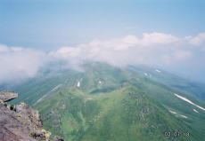 ここまでくもりだったが、気圧の谷が通りすぎたのか、太陽がガンガンに照りつけるようになってきた。ノドが乾く。今日は天気が悪いつもりでいたので、水は少な目にしか持っていなかった。失敗だ・・・。空身で山頂に向かったが、空身でもヨレヨレ状態。硫黄岳は羅臼から知円別にかけての稜線から少しずれているため、西側の山並の展望がすこぶる良好。少し霞んでいるのが残念だが・・・。