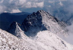 涸沢岳に行ってみることに。雲の切れ間から、常念山脈、奥穂、北穂などが見えたり隠れたり。小屋に戻って昼飯。昼飯のあと、今度は奥穂高岳に登りに行った。 ガスが晴れたりかかったりで、涸沢岳に行った時と変わらなかったが、見えた時は逆に幻想的な見え方をしていた。また、ブロッケン現象が見えたりして、楽しむことができた。景色は良かったが、寒くて長居はできなかった。 |