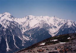 前常念までは雪、岩、ハイマツの快適な尾根歩き。前常念からは巨岩の道を急降下。尾根からはずれて、長い長いジグザグの道をヘトヘトになりながら登山口まで降りた。 |