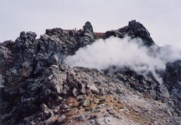 登山道のすぐ脇から噴煙が上がっている。熱気を感じる。現在、南峰は登山禁止となっている。噴気孔に近いのは北峰なのに、なんで南峰が禁止なのだろう・・・?南峰は切り立っていて、危ないから禁止にしているのかも・・・? |