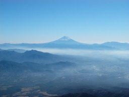 赤岳山頂からは富士山もバッチリ。朝の冷え込みに伴う放射霧の名残か、甲府盆地はまだモヤっていた。