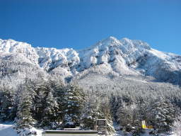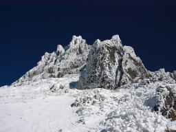 山肌や樹林に雪がビッシリと付いて、景色は真冬並みだが、積雪は少ないので、真冬はナイフリッジになる稜線直下は、ほぼ夏道感覚で通過できた。 |