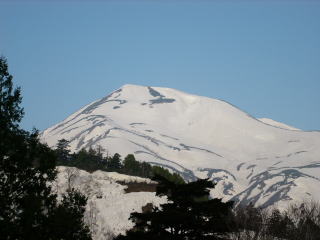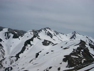 山頂では十数人の人が和んでいた。この頃には薄雲はだいぶ取れてきて、白かった空はだいぶ青くなった。稜線の反対側には、毛勝三山から剣につながる尾根が迫っていた。左側には小蓮華山の稜線が、そして、北には旭岳を隣りに従えた白馬岳がデンと座っていた。なかなかの景観だった。稜線の風上側はほとんど雪が付いていなく、ハイマツと地面が露出していた。少し休んでからK太郎君を交えて記念撮影。 ■5月5日(月) 晴れ 蓮華温泉⇒天狗原⇒栂池