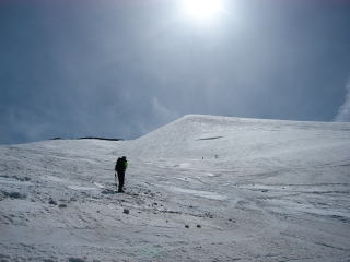 瀬戸川にもシールを貼る人とかでたむろっていた。始めは緩い登りだが、そのうち急になってくる。急になったり緩くなったりを繰り返しながら、この沢は行き止まりとなる。そして、いったん板をはずし、トラバース気味に1本右の沢に移る。この間はしっかりした踏み跡がついていた。ここからも緩急を繰り返しながら、沢をひたすら詰めることになる。