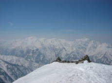 南峰で缶ビールを分け合って飲み、しばらく頂上からの景色を楽しみ、滑降に備えて体を休める。あとは南峰を下れば滑降予定地点だ。ここまでノーアイゼン&ピッケルで登って来たが、南峰からの下りはアイゼンを履き、ピッケルを出す。今日は山頂付近もかなり気温が高いようで、岩に付いた雪は腐り気味で不安定。ピッケルを刺しても効かない状態だった。