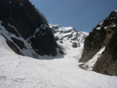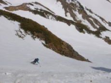 滑りは苦痛だったが、ロケーションは抜群!真っ青な空、鋭い岩峰、深く切れ込んだ残雪の谷のコントラストが絶妙だ。傾斜が緩くなったあたりで、ほんの一時デブリがなくなる。この部分だけは楽しくすべることができたし、足の負担も軽かった。しかし、それは長続きせず、すぐにまたデブリ地獄が始まった。ただ、傾斜が緩いので足への負担は軽減されてきた。やがて谷が広くなり、傾斜も落ちる。堰堤をいくつか越えると、やっと西俣出合。長かった・・・・。出合から少し下ったところで、待望の休憩。板をはずすのも億劫なほど疲れていた。