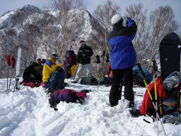 先発隊は普通なら1時間チョイで登るところ、2時間半前後かけての前山登頂!天気は基本は晴れだが、時々薄雲がやってきて、太陽を隠していた。太陽が隠れるとやや寒いが、風がないので、この時期としてはかなり暖かいほうだ。肝心の雪が腐ってしまう・・・。