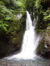 ホチの滝を通過するとしばらくで、ゴルジュの中にある5m+3mの滝が立ちはだかる(上の左から3番目の写真)。右壁には残置のシュリンゲが垂れており、残置ハーケンもところどころあった。S藤さんが挑戦するが手強いよう。ヌルヌルの岩とグラグラのハーケン。辞めといたほうが良さそうだなあと思って見ていたが、やっぱり無理みたいで断念。水流際にも残置シュリンゲがあり、挑戦してみたかったが、人数も多いので巻こうということになった。両壁とも高くて切り立っており、巻きも悪そうに見えたが、左岸に登山道並みの巻き道ができていた。あっさり高巻く。