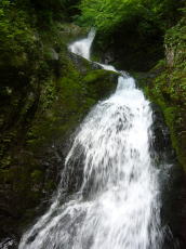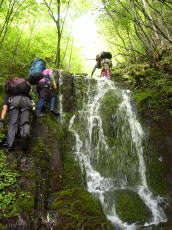 右の支沢に進路を取ると、水量は半減した。しかし、小滝が連続する、なかなか楽しい部分が続いた。ひとつ、水流があるにもかかわらず、全面明るい緑色の苔に覆われた滝があった。その先も小滝が続き、なんともあっけなく登山道に出た。登山道の先も滝が連続していた。登山道の少し上に、雁坂小屋の水源があった。ということは、今遡ってきたのが本流ということだ。正面のガレ沢が本流かと思ったのだが・・・。休憩していると、ガレ沢を登って行った先行パーティーがやって来た。少し休憩して雁坂小屋へ。